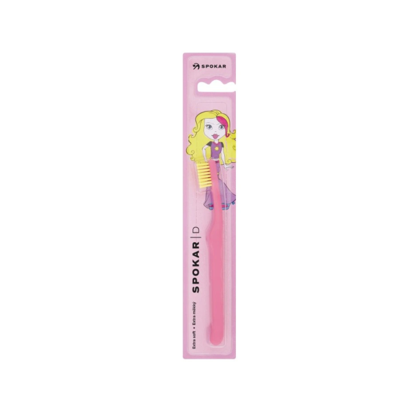 Зубна щітка ДИТЯЧА D Spokar екстрам’яка, рожева ручка / жовта щетина (від 0 до 6 років)
