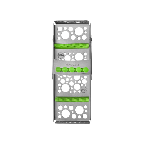 Касета для стерилізації вміщує 5 стоматологічних інструментів та завдяки спеціальній формі фіксаторів інструменти не ковзають у контейнері та надійно захищені від ушкоджень під час транспортування.
