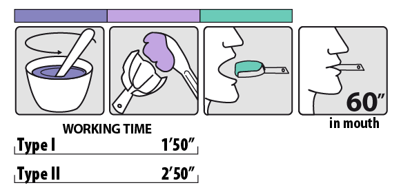 iQ chrom — стоматологічний альгінат з хроматичним фазовим індикатором для зліпків (фіолетовий: змішування -> бузковий: завантаження ложки -> зелений: введення в рот).