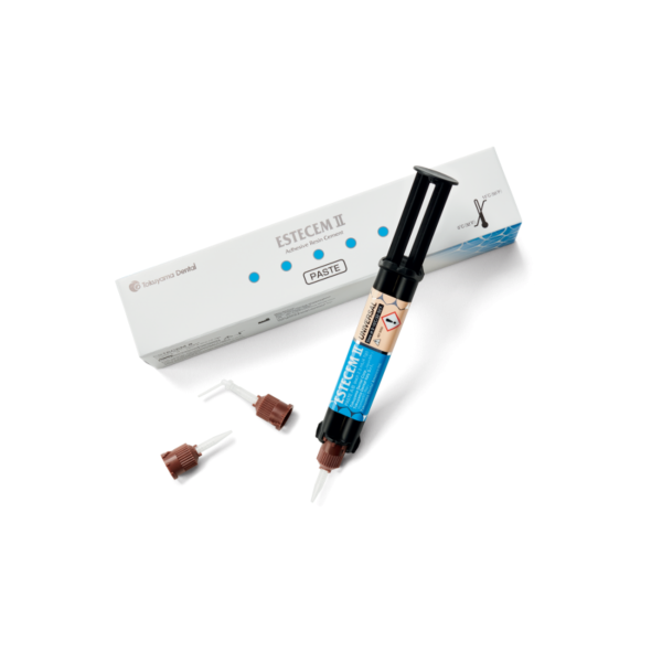 ESTECEM II – рентгеноконтрастный двойного отверждения (свет и/или самотвердеющий) адгезивный композитный цемент с отличными свойствами с точки зрения манипуляции, эстетики и адгезии с зубами и всеми зуботехническими материалами.