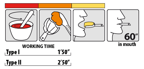 iQ tropical - стоматологический альгинат с хроматическим фазовым индикатором для слепков (красный: смешивание -> оранжевый: загрузка ложки -> желтый: введение в рот).