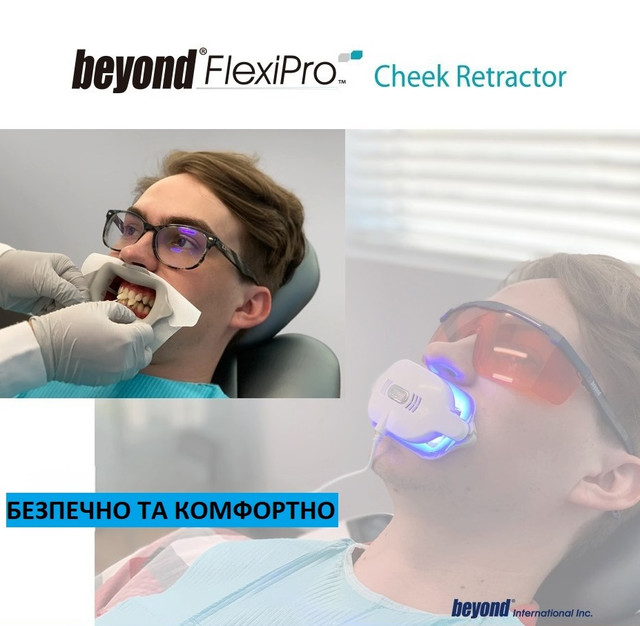 Ретрактор BEYOND FlexiPro призначений для ідеального доступу до передньої групи зубів під час процедури відбілювання зубів, а також для захисту області губ. Має вбудований тримач язика, перемичку, яка утримує язик пацієнта під час процедури, водночас виконує роль амортизатора для прикусу, на який пацієнт може спиратися зубами.